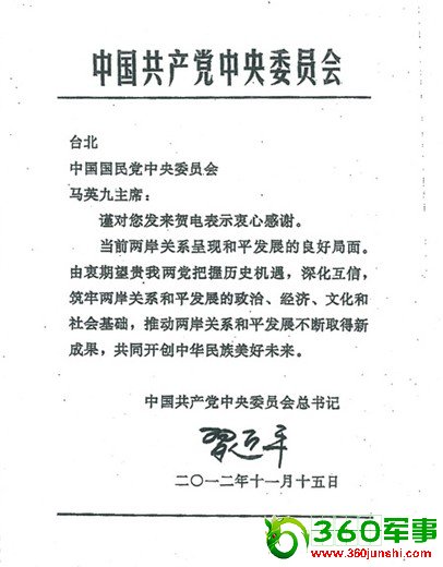 中评社台北11月15日电(记者 周怡伦)卸下中共中央总书记职务的胡锦涛今午收到中国国民党荣誉主席吴伯雄的致意电函后,下午随即亲笔签名回函吴伯雄致谢。
